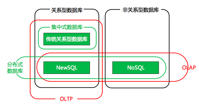 数据库根据其数据模型,可分为关系型数据库(RDBMS)和非关系型数据库(NoSQL)。其中,关系型数据库根据其技术特性,分为传统关系型数据库和NewSQL数据库;根据业务负载特征,可分为OLTP数据库和OLAP数据库。