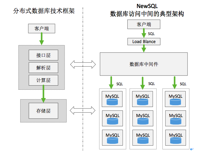 在上述架构中,数据库访问中间件实现接口层、解析层、计算层的相关能力,传统关系型数据库(如MySQL)实现存储层的相关能力。