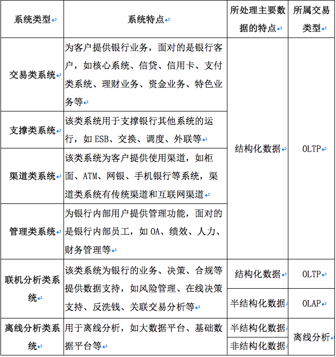 应用系统按其所处理的业务特点,可分为交易类系统、支撑类系统、渠道类系统、管理类系统和分析类系统,其中分析类系统可分为联机分析类系统和离线分析类系统,各类系统特点如下: