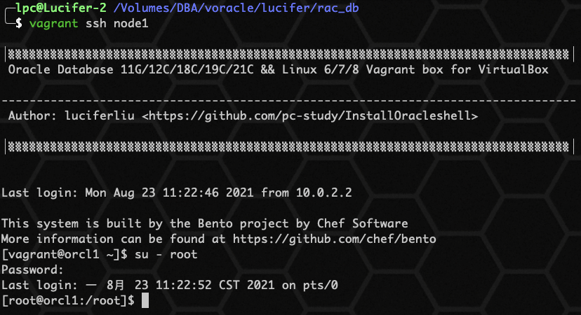 2、使用 vagrant ssh 来连接,注意要在 rac_db 目录下执行,连接进去是 vagrant 用户,使用 su - oracle 来切换即可。