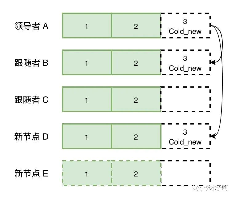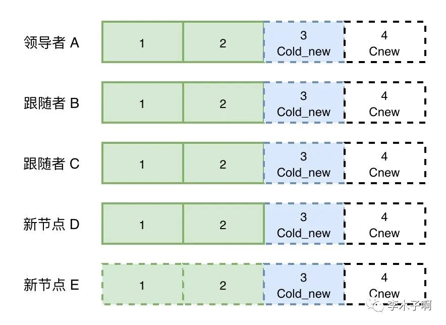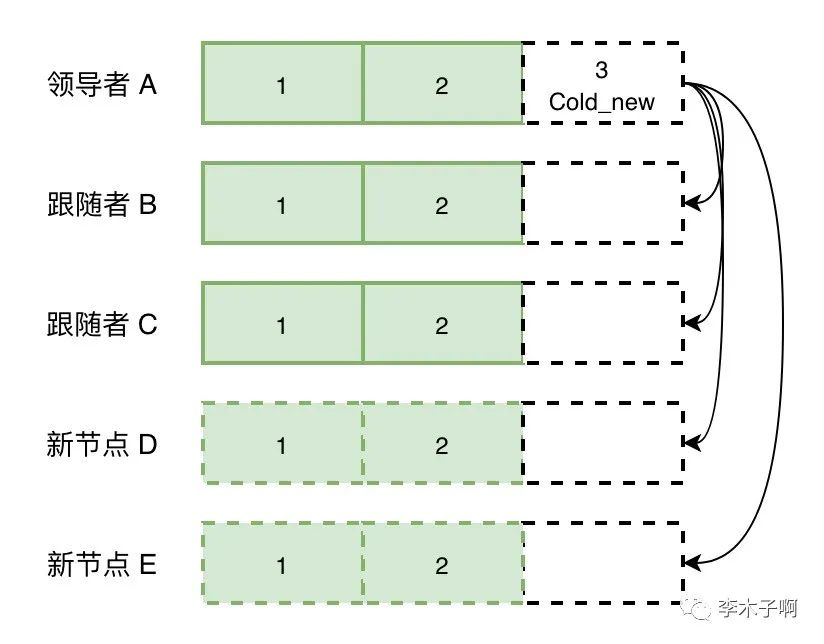 1.首先领导者向集群中发送一条配置变更日志,告诉其他节点集群中要新增两个节点。根据约定一,日志会被复制到新老配置的所有节点。需要注意的是,raft 算法在日志复制过程中会保证日志完整性,所以新节点在复制 Cold_new 之前会同步领导者的数据。