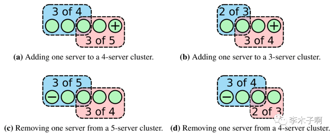 就是一个数字肯定小于两个超过数字一半的数字之和。对于 raft 集群来说,旧配置的大多数与新配置的大多数之和一定大于新配置的节点个数。由于 raft 算法的领导者选举需要获得超过大多数选票,而当我们只新增一个节点的时候,旧配置的大多数和新配置的大多数不可能同时存在(否则必定有至少一个节点同时属于两个分区,这显然是不可能存在的),因此两个分区只有一个分区可能选举出领导者。正如下图所示(来自《CONSENSUS: BRIDGING THEORY AND PRACTICE》[1]):