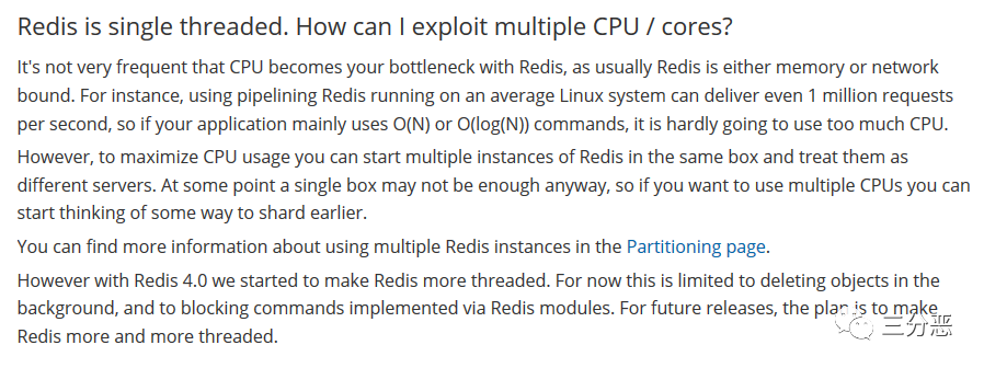 同时FAQ里还提到了, Redis 4.0 之后开始变成多线程,除了主线程外,它也有后台线程在处理一些较为缓慢的操作,例如清理脏数据、无用连接的释放、大 Key 的删除等等。