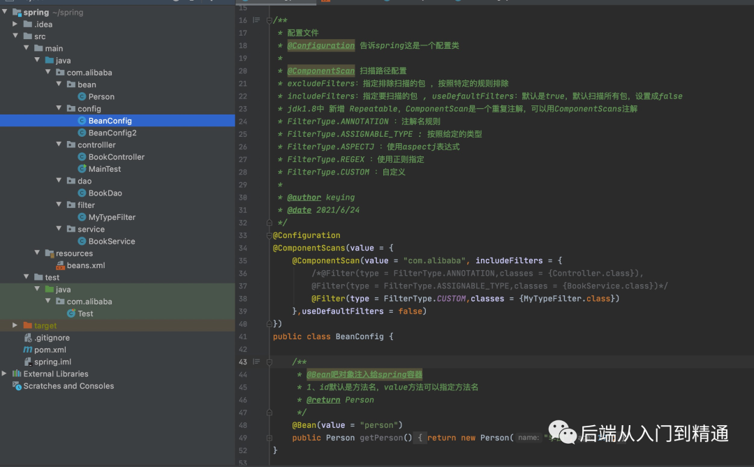 /*** 配置文件* @Configuration 告诉spring这是一个配置类** @ComponentScan 扫描路径配置* excludeFilters:指定排除扫描的包 ,按照特定的规则排除* includeFilters:指定要扫描的包 , useDefaultFilters:默认是true,默认扫描所有包,设置成false* jdk1.8中 新增 Repeatable,ComponentScan是一个重复注解,可以用ComponentScans注解* FilterType.ANNOTATION :注解名规则* FilterType.ASSIGNABLE_TYPE : 按照给定的类型* FilterType.ASPECTJ :使用aspectj表达式* FilterType.REGEX :使用正则指定* FilterType.CUSTOM :自定义** @author keying* @date 2021/6/24*/@Configuration@ComponentScans(value = {@ComponentScan(value = "com.alibaba", includeFilters = {*@Filter(type = FilterType.ANNOTATION,classes = {Controller.class}),@Filter(type = FilterType.ASSIGNABLE_TYPE,classes = {BookService.class})*/@Filter(type = FilterType.CUSTOM,classes = {MyTypeFilter.class})},useDefaultFilters = false)})public class BeanConfig {/*** @Bean吧对象注入给spring容器* 1、id默认是方法名,value方法可以指定方法名* @return Person*/@Bean(value = "person")public Person getPerson(){return new Person("李四",19);}}