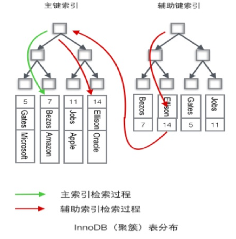 在MySQL中为了支持事务,选取的存储引擎为Innodb,而在Innodb引擎中,数据存储采用的是索引组织表形式(IOT),即以B+树的形式将聚集索引信息与数据共同存储维护,数据位于叶子节点的位置。当未显示指定主键时,Innodb会选择第一个不包含Null值的唯一索引作为主键索引。若表使用了自增主键,则每次插入记录时,会顺序添加到索引节点的后续位置,插入效率较高。而使用非自增主键时,每次插入都有可能为了维护顺序去移动数据,除增加开销外还会产生较多的碎片。下图简要示意了MySQL中主键索引与二级索引的数据访问过程。