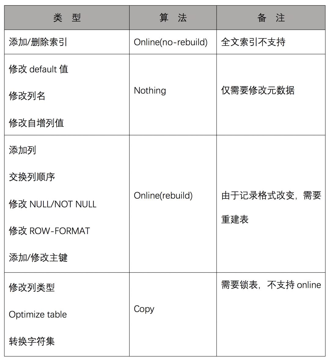 commit阶段,升级到EXCLUSIVE-MDL锁,禁止读写操作;重做最后row_log中最后一部分增量;更新innodb的数据字典表;提交事务(刷事务的redo日志)修改统计信息;rename临时idb文件,frm文件。