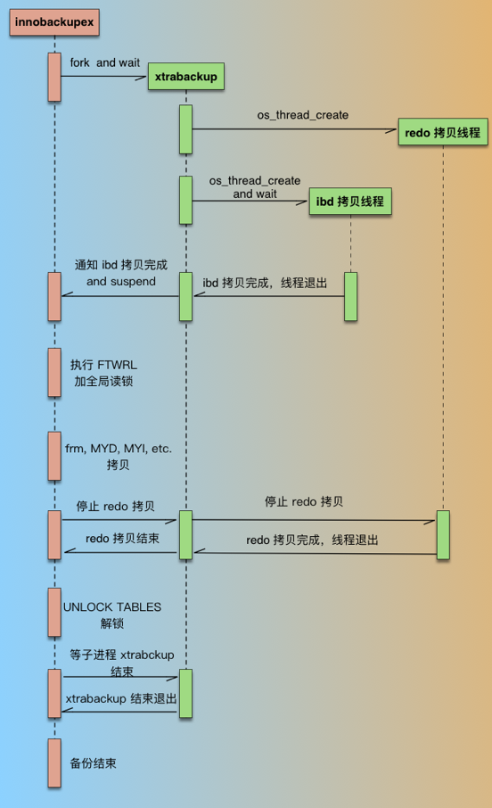 开始备份后fork进程启动xtrabackup进程,xtrabackup进程开始备份idb文件。在备份Innodb数据时,通过两个线程分别对redo文件以及ibd文件拷贝。
