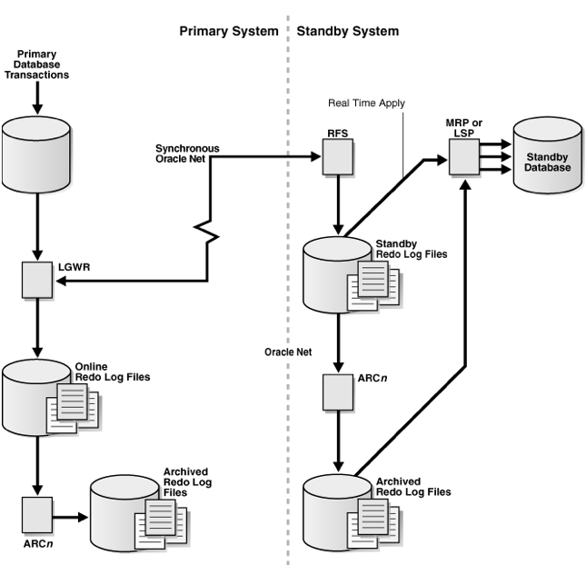 Oracle数据库复制依靠Data guard机制实现,该机制中应用最广泛的配置原理是通过LGWR进程在把日志写到本地联机日志的同时,还发送一份给本地的LSN进程,该进程再将日志内容通过网络发送至备库,当LGWR进程配置为SYNC同步模式时,LGWR必须等待写入本地联机日志和LSN进程传送成功,主库的事物才能提交,而备库的RFS进程在收到日志内容后会立即写入standby redo log并由MRP进程完成介质恢复。整个过程如下图所示: