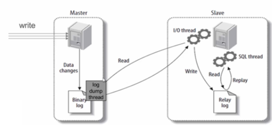 MySQL数据库在数据复制的过程中主要靠3个线程来完成,分别是binlog dump thread,I/O thread以及SQL thread。当主库发生写操作并commit时,其事件会写入binlog文件,并创建log dump线程告知从库。主库I/O线程会将binlog名称和当前更新的位置同时传给从库的I/O线程,从库I/O线程会将复制过来的binlog副本存入relay log,最后SQL线程检测到relay log有更新后开始将事件进行重演,完成数据同步。整个过程如下图所示: