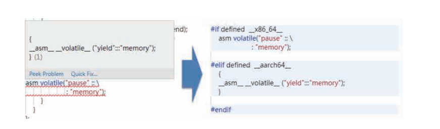 目前使用华为鲲鹏源码迁移工具可以很轻松的做完基础的代码迁移。迁移工具提供了图形化的方式进行代码的静态扫描,能够提供类似于现代IDE的代码修复提示以及交互式修改的方式快速的完成基础代码的修改。下图是一个基础修改的代码示例。