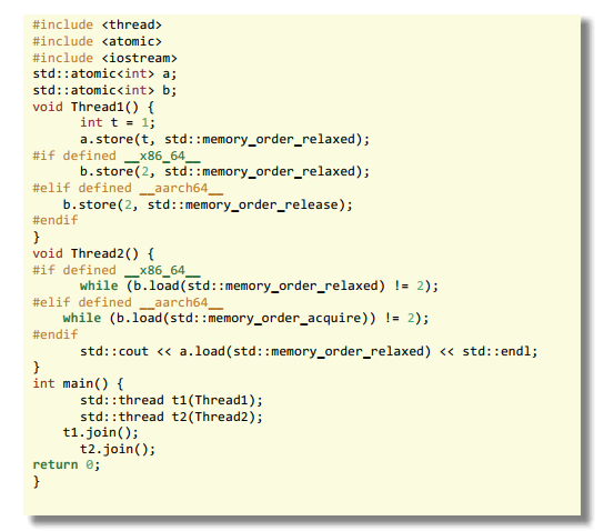 华为鲲源码迁移工具还提供对代码的弱内存序的扫描。尤其是对于X86平台迁移的代码,需要进行弱内存序的加固。目前对于弱内存序,迁移工具只能做到初步揭示,需要根据使用使用的场景,修改响应的代码。以下是一个弱内存序的示例。在X86平台下,程序的输出为1;不修改代码在ARM上运行可能是0也可能是1;这里修改成release-acquire模型之后,输出符合预期。
