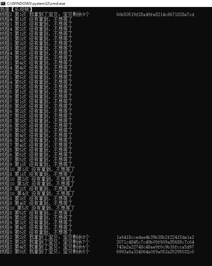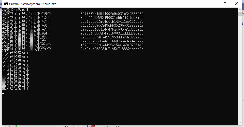 //业务:悲观锁方式public static void PessimisticLock(){int num = 10; //总数量string lockkey = "xianseng";//悲观锁开启20个人同时拿宝贝for (int i = 0; i < 20; i++){Task.Run(() =>{string selfmark = "";try{if (Lock(lockkey, out selfmark)){if (num > 0){num--;Console.WriteLine($"我拿到了宝贝:宝贝剩余{num}个\t\t{selfmark}");}else{Console.WriteLine("宝贝已经没有了");}Thread.Sleep(100);}}finally{UnLock(lockkey, selfmark);}});}Console.ReadLine();}//业务:乐观锁方式public static void OptimisticLock(){int num = 10; //总数量string lockkey = "xianseng";//乐观锁开启10个线程,每个线程拿5次for (int i = 0; i < 10; i++){var lineOn = "线程" + (i + 1);Task.Run(() =>{for (int j = 0; j < 5; j++){string selfmark = "";try{if (Lock(lockkey, out selfmark, 10, 0)){if (num > 0){num--;Console.WriteLine($"{lineOn} 第{(j+1)}次 我拿到了宝贝:宝贝剩余{num}个\t\t{selfmark}");}else{Console.WriteLine($"{lineOn} 第{(j + 1)}次 宝贝已经没有了");}Thread.Sleep(1000);}else{Console.WriteLine($"{lineOn} 第{(j+1)}次 没有拿到,不想等了");}}finally{UnLock(lockkey, selfmark);}}});}Console.ReadLine();}