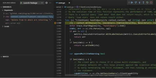 然后在项目的conn.go文件内找到handleQuery函数,在第一行加上断点,这里是最先接受query的地方。通过在psql内执行delete from t1 where a=1 returning *;这样一句DML,触发刚刚设置的断点,可以在左边变量窗口里看到我们输入的sql。到此开发环境的问题都解决了,又能进行TiDB for PostgreSQL的Hacking Camp的任务了,我们已经把计划任务都放到Issue里面,如果您感兴趣的话可以来围观一下,https://github.com/DigitalChinaOpenSource/TiDB-for-PostgreSQL/issues。