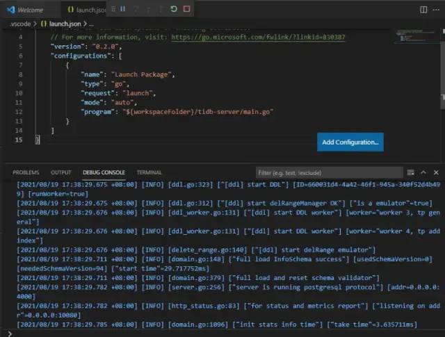配置好launch.json,就可以点击运行按钮调试了,可以看到tidb启动过程的log都能正确的输出到DEBUG Console里,一下子宽心很多。