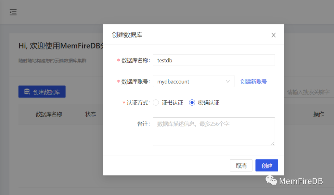 我们这里使用 memfiredb.com 登录之后点击创建数据库,输入相应的信息就可以完成数据库的创建了: