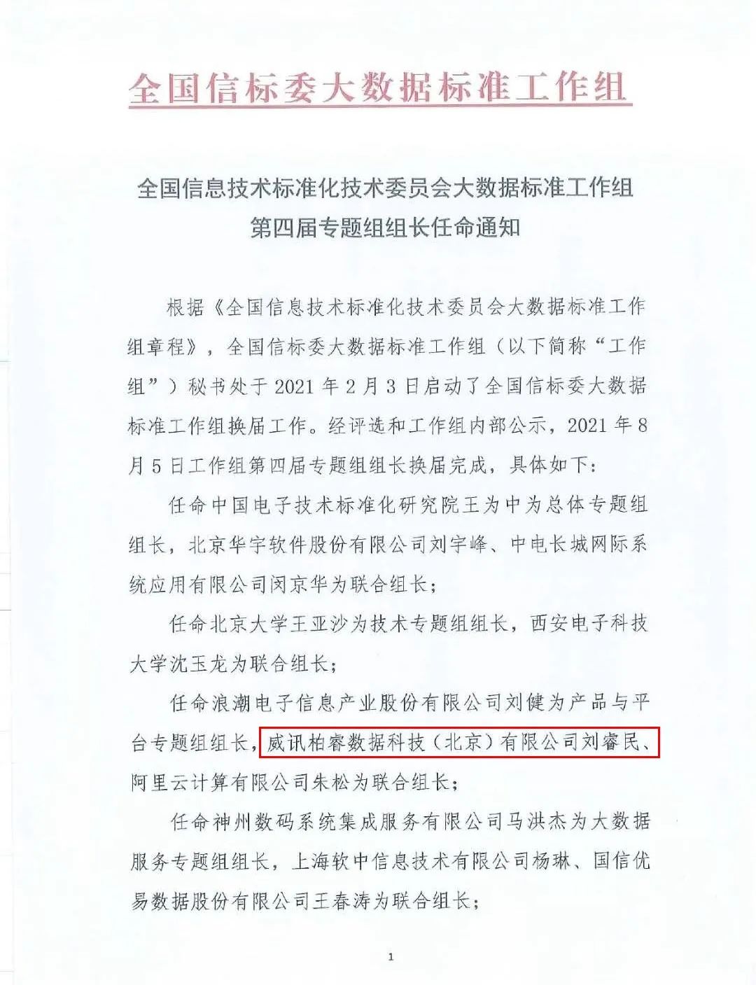 柏睿董事长刘睿民被任命为大数据标准工作组