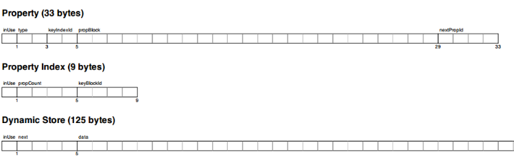 ( 2). 属性:也是固定大小链表,每个属性记录包括4个属性块和指向属性链中下一个属性的ID。属性记录包括属性类型和指向属性索引文件的指针。同时属性记录中可以内联动态存储,在属性值存储占用小时,会直接存储在属性记录中,对于大属性值,可以分别存储在动态字符存储和动态数组存储中。