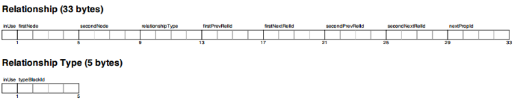 ( 3). 关系:双向链表,这个链表也是固定大小;包含是否被使用的标志位,起始节点的ID,结束节点的ID,关系类型,起始节点的上下联系和结束节点的上下节点,以及一个指示当前记录是否位于联系链的最前面。需要强调的一点是关系必须有方向,也就是说有起点、终点。