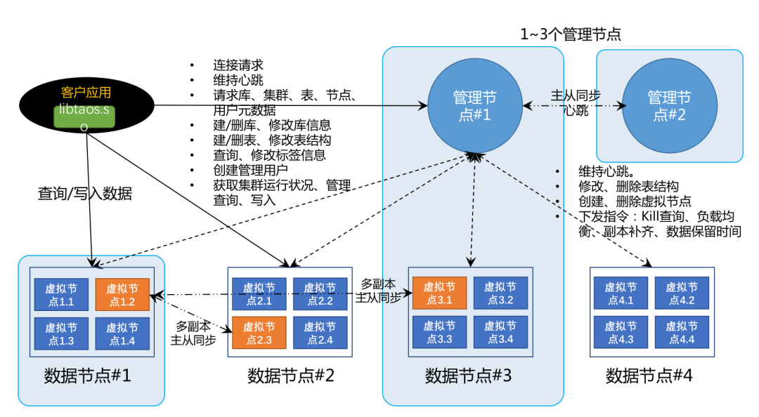 我们现在具体聚焦一下 TDengine 的整体架构。在 TDengine 中每个采集点是一张表在 TDengine 中,TDengine 在设计之初是分布式架构,大家从这张图可以看出来,这张图写了 4 个节点,可以部署在 4 台机器上,根据配置,每个节点可以承担不同的功能。数据节点 3 和数据节点 4 写了两个管理节点。除了管理节点之外,还有数据节点功能,管理节点主要是做什么?管理节点在 TDengine 中主要是存储元数据,比如表的分布信息、集群状态管理、状态维护等等。数据节点是专门存储数据的功能。怎么做写入和查询?首先,客户端发请求到管理节点去要表的信息,比如我要写一张表,这张表到底在哪里,管理节点将这些信息返回给客户端应用。假设这个查询和写入覆盖很多个节点上不同的 vnode,会下发各个子请求下去,下去之后进行并发进行处理。在数据节点上我们做了虚拟化,我们认为在一个数据节点上可以划分为多个虚拟节点,每个虚拟节点存储了部分表的数据,同时,虚拟节点还是做高可靠的一个单元,比如虚拟节点 1.2、2.3、3.1 可以在 TDengine 中组成一个虚拟节点组,虚拟节点组中的各个节点可以互为备份。假设 1.2 这个节点出现问题,虚拟节点 2.3 和 3.1 都可以起来服务。4. 多种数据类型、极致的存储压缩
