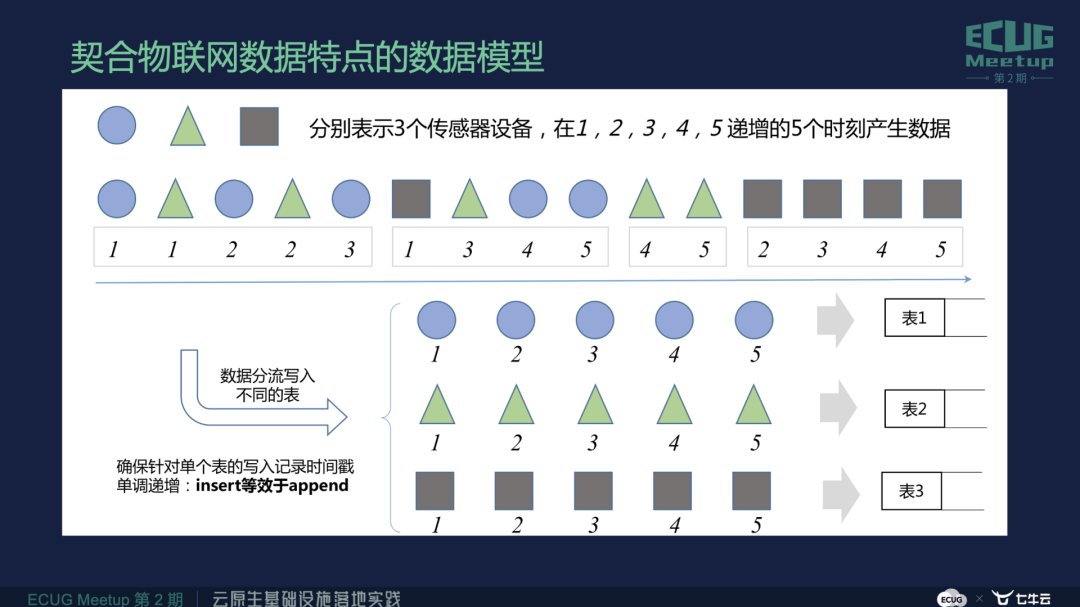 上面三张图显示了三个传感器的设备,“12345”表示这三个传感设备在不同的时刻产生的数据。它的顺序可能是这样的,但一个传感器采集的数据是有序递增的,在 TDengine 中,一个传感器、一张表的好处在于将这些数据分流在不同的表中,在不同的表中相当于做了一个分流,如果不做这样的 append,查找一类的就比较麻烦。所以将一个写入做成一个 append,只有 O(1) 的时间复杂度,因此写入的复杂度会大大提升。后面会讲乱序数据怎么处理。6. 数据节点虚拟化