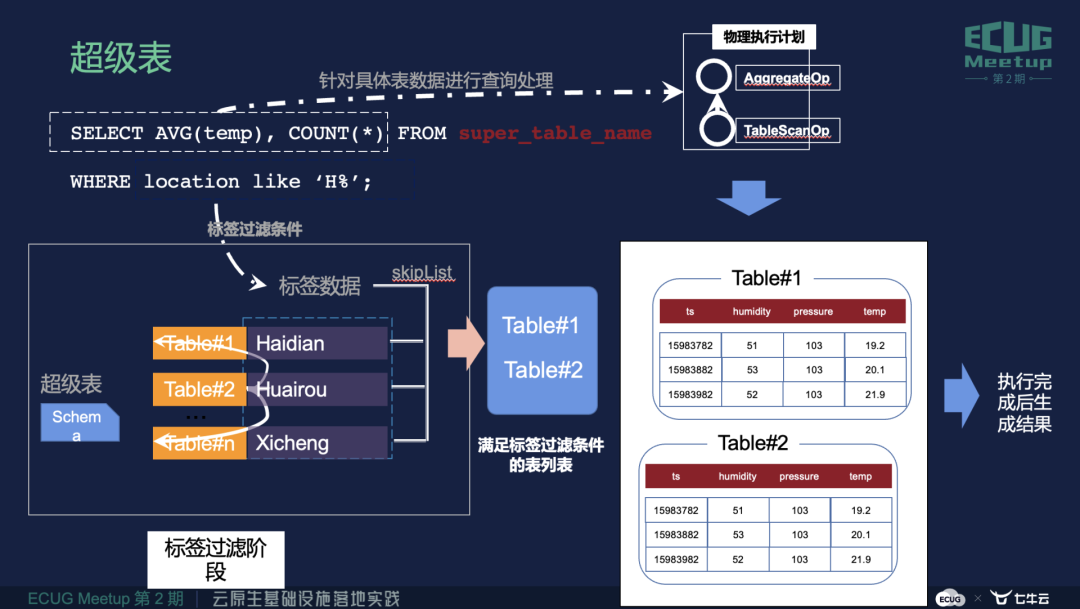 大家注意到这个模型有个缺点,一个设备一张表,假设有 1 个亿传感器,要建 1 亿张表,要想查某个小区的传感器的求和,要把所有的表都扔进去吗?这显然是不合理的。怎么解决这个问题?前面讲到我们一般查询某些具有共同属性的时间线聚合,我们怎么把共同属性表达出来?系统中用的是超级表,超级表是具有沟通的 Schema(音译)、共同元数据表的集合,可以认为创建一个超级表,它下面可以有很多子表,对超级表的查询相当于作用到它下面所有的子表。比如可以查一个超级表的平均值,假设它下面有 100 万张表,我就相当于对这 100 万张表做了查询,这样用一个超级表就解决了这个问题。另外,我们还提供了动态建表的功能,刚才竞品提到 InfluxDB,它的优点是写入时间创建表,我们没有采用这个方式,我们采用的是一个可以提供自动建表,可以指定表名,同时指定它的超级表名,然后给它的值,写入的时候 TDengine 会自动检测,同时将数据写入。这是超级表在 TDengine 中的分布情况,超级表还有一个好处,它的 Schema 是所有子表共享的,这样 Schema 只需要存一份就可以了。内存中缓存了超级表与子表的关系,同时存储了每个表的值,这样做标签过滤时在内存操作的,速度非常快。做真实的数据查询是首先进行标签的过滤,过滤出相应的表,将表的数据返回到客户端,客户端拿到这些表的分布,到对应的节点上查相应的表。这个过程采用的是标签静态数据和动态数据分离,可以有效消除冗余和降低存储成本。另外,超级表还有一个好处是动态增删某些属性非常方便,只需要对一张超级表增删就可以了。这是超级表的查询例子,它的标签是这种形式的,第一步先做标签过滤,过滤出哪些表满足这些条件,这些表的分布返回客户端,客户端拿到这些分布去相应的节点上查询相应的表数据。在服务端聚合后,会返回到客户端进行二阶聚合。8. 基于预计算(SMA)的查询处理