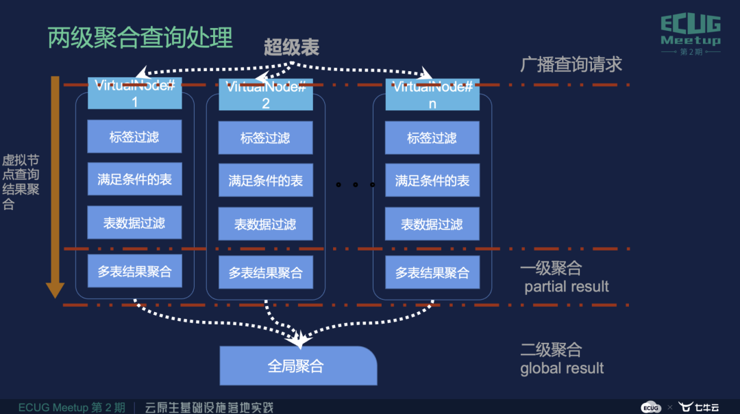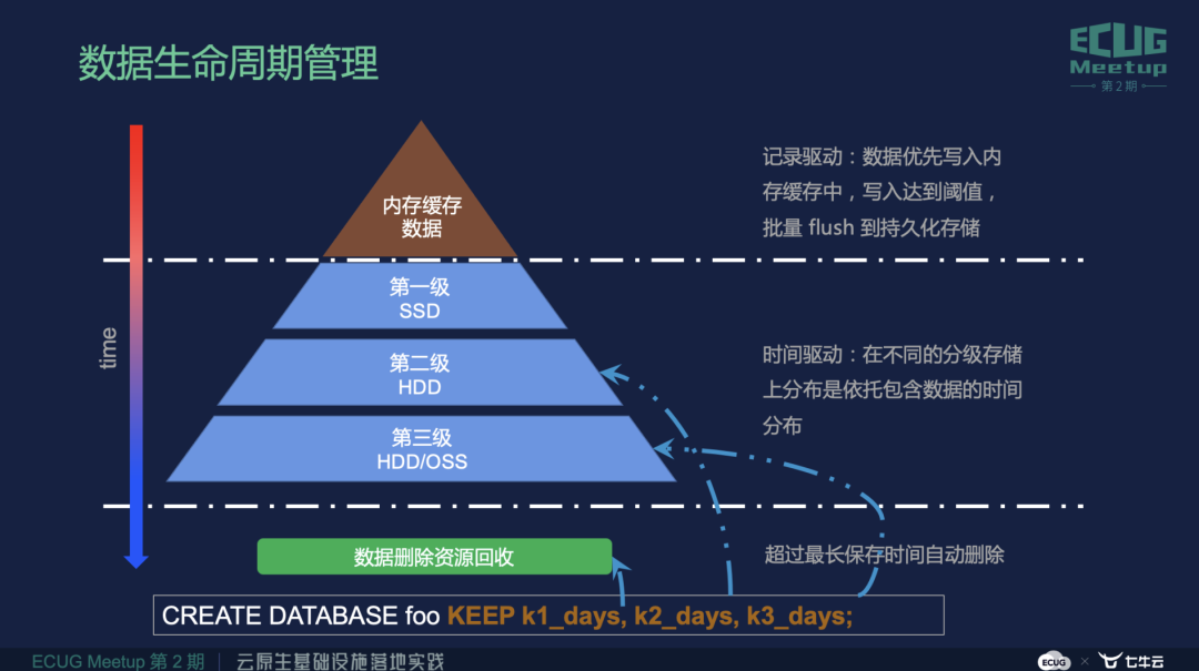 这是两级聚合,因为我们把数据打散到各个 vnode 当中,查询时是多个子查询并发打下去,打下去每个 vnode 并行计算,计算之后得到一个结果。比如算 SAM 值,算 1 亿张表求和,假如它有 10 个 vnode,发 10 个请求,每个 vnode 并行一个 SAM 值上来,将这个 SAM 返回客户端,客户端做第二级查询,就可以得到这个值了。10. 数据生命周期管理
