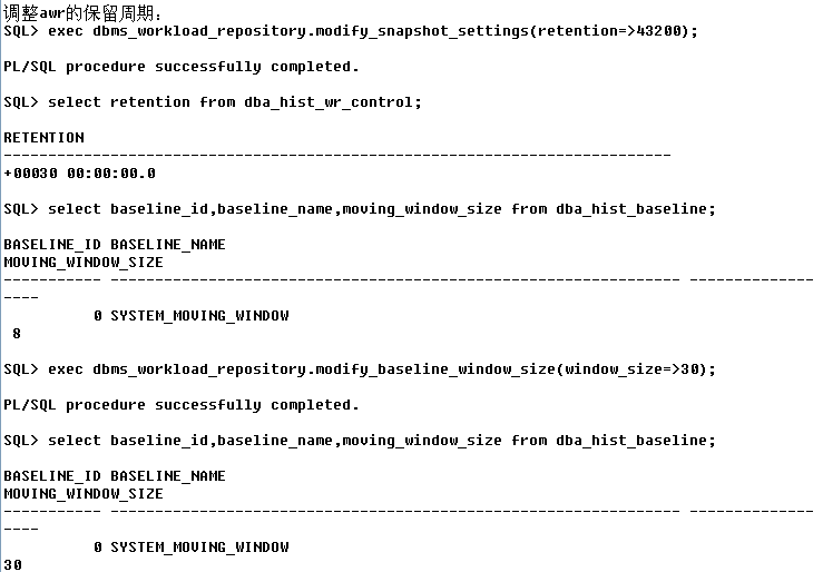 Oracle Database 会自动维护系统定义的 moving window baseline,系统定义的 moving window baseline 的默认窗口大小就是当前的 AWR 保留期,如果打算使用自适应阀值,请考虑使用更长的移动窗口,比如 30 天,以便精确的计算阀值。移动窗口的大小调整为小于或等于 AWR 的保留天数,因为要增加移动窗口的大小,必须要先增加相应的 AWR 保留期限。