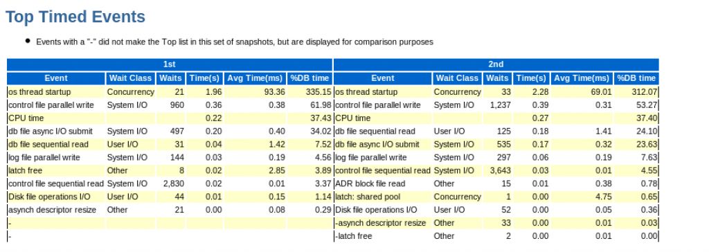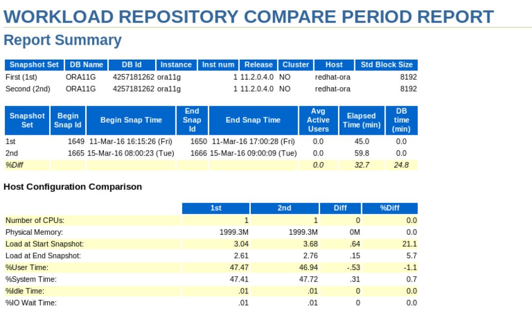 由于基线又由于可以一直保存在 AWR 快照中,DBA 做性能分析时则可以利用基线和故障时段的 AWR 做对比,更进一步的分析数据库的性能趋势变化,下面简单的来做一个 AWR 数据时段对比: