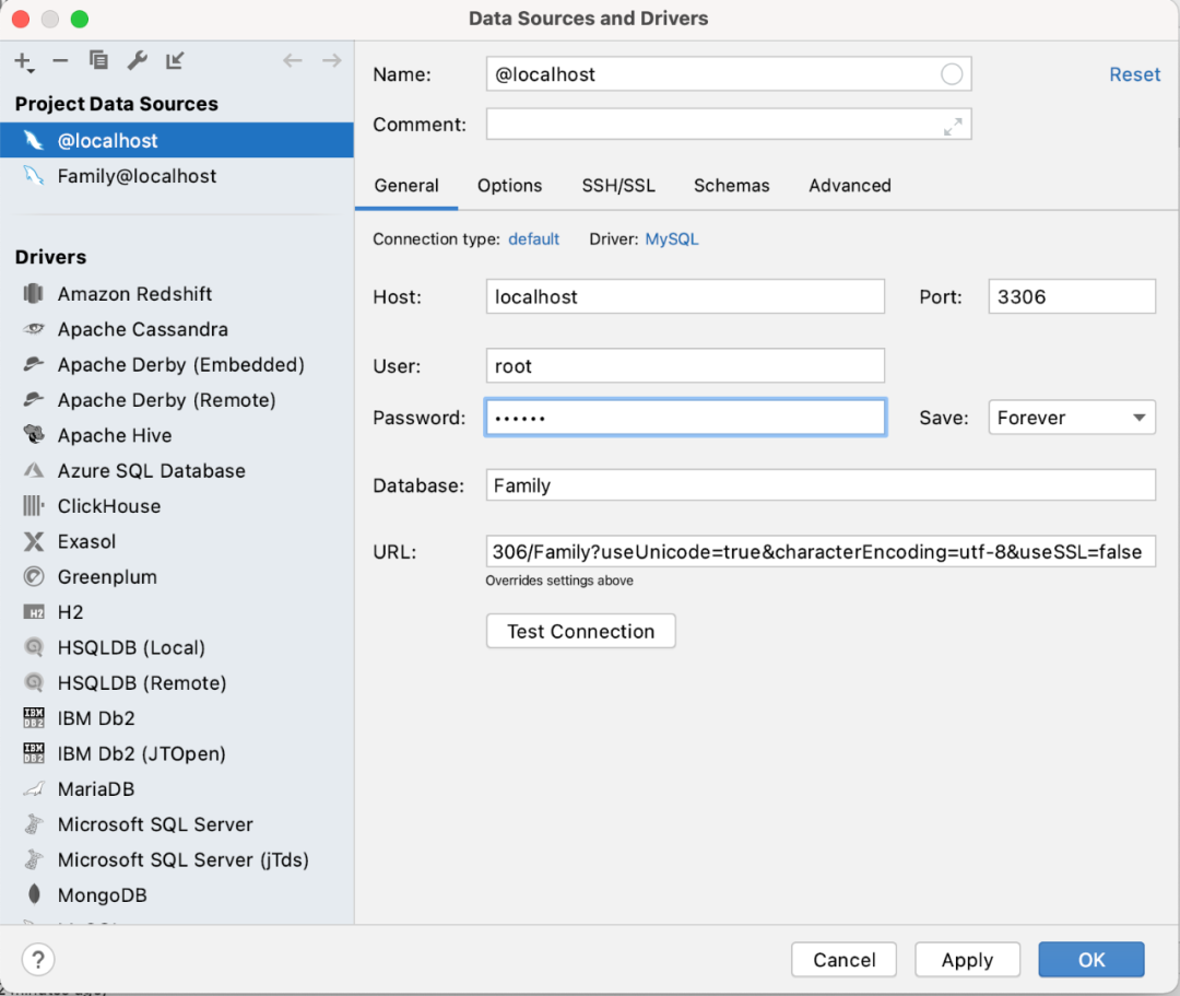 url: jdbc:mysql://localhost:3306/Family?useUnicode=true&characterEncoding=utf-8&useSSL=false
