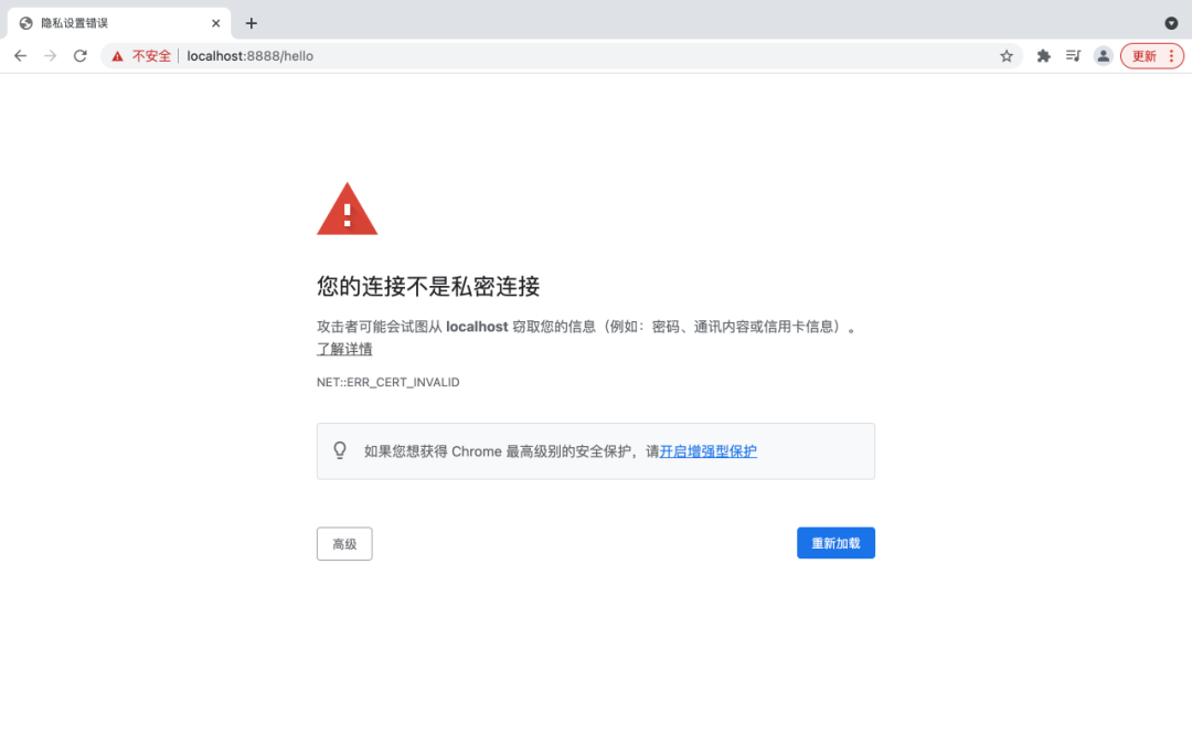 用HTTP协议的80端口访问会自动跳转到HTTPS协议的8888端口。这时当我们访问http://localhost:80/hello时会自动跳转到https://localhost:8888/hello。