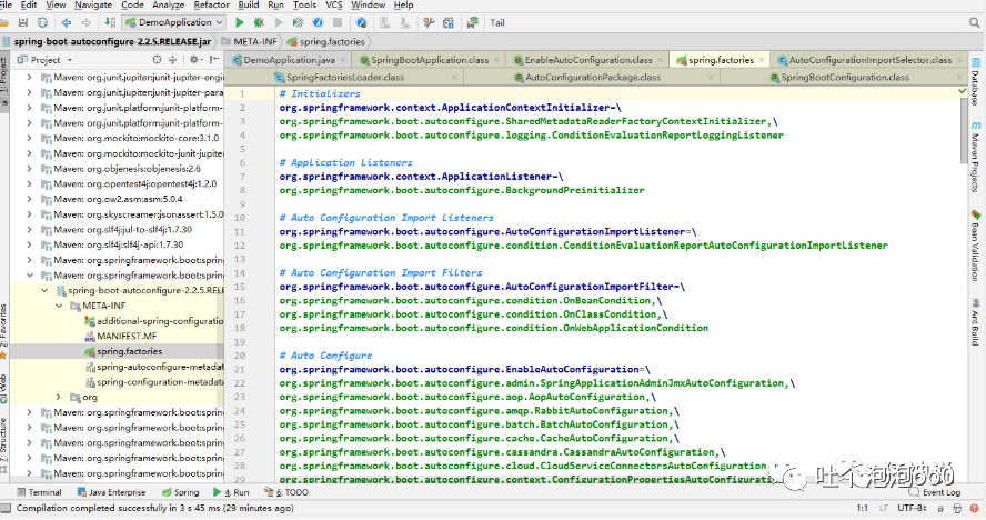 所以,自动配置真正实现是从classpath中搜寻所有的META-INF/spring.factories配置文件 ,并将其中对应的 org.springframework.boot.autoconfigure. 包下的配置项,通过反射实例化为对应标注了 @Configuration的JavaConfig形式的IOC容器配置类 , 然后将这些都汇总成为一个实例并加载到IOC容器中。