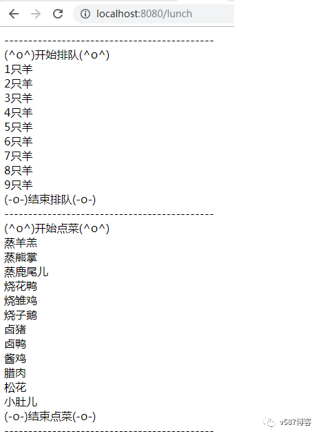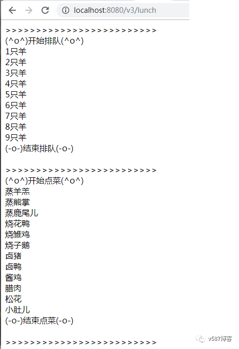 package com.gavin.controller;import org.springframework.web.bind.annotation.GetMapping;import org.springframework.web.bind.annotation.RestController;/*** Created by 海文*/@RestControllerpublic class DemoController {@GetMapping("/lunch")public String haveLunch(){StringBuilder builder = new StringBuilder();builder.append("<html>");//排队builder.append(String. format ("%s<br/>","--------------------------------------------"));builder.append(String. format ("%s <br/>","(^o^)开始排队(^o^)"));builder.append(String. format ("%s <br/>","1 只羊"));builder.append(String. format ("%s <br/>","2 只羊"));builder.append(String. format ("%s <br/>","3 只羊"));builder.append(String. format ("%s <br/>","4 只羊"));builder.append(String. format ("%s <br/>","5 只羊"));builder.append(String. format ("%s <br/>","6 只羊"));builder.append(String. format ("%s <br/>","7 只羊"));builder.append(String. format ("%s <br/>","8 只羊"));builder.append(String. format ("%s <br/>","9 只羊"));builder.append(String. format ("%s <br/>","(-o-)结束排队(-o-)"));//点菜builder.append(String. format ("%s<br/>","--------------------------------------------"));builder.append(String. format ("%s <br/>","(^o^)开始点菜(^o^)"));builder.append(String. format ("%s <br/>","蒸羊羔"));builder.append(String. format ("%s <br/>","蒸熊掌"));builder.append(String. format ("%s <br/>","蒸鹿尾儿"));builder.append(String. format ("%s <br/>","烧花鸭"));builder.append(String. format ("%s <br/>","烧雏鸡"));builder.append(String. format ("%s <br/>","烧子鹅"));builder.append(String. format ("%s <br/>","卤猪"));builder.append(String. format ("%s <br/>","卤鸭"));builder.append(String. format ("%s <br/>","酱鸡"));builder.append(String. format ("%s <br/>","腊肉"));builder.append(String. format ("%s <br/>","松花"));builder.append(String. format ("%s <br/>","小肚儿"));builder.append(String. format ("%s <br/>","(-o-)结束点菜(-o-)"));//取餐builder.append(String. format ("%s<br/>","--------------------------------------------"));builder.append(String. format ("%s <br/>","(^o^)开始取餐(^o^)"));builder.append(String. format ("%s <br/>","一盘蒸羊羔"));builder.append(String. format ("%s <br/>","一盘蒸熊掌"));builder.append(String. format ("%s <br/>","一盘蒸鹿尾儿"));builder.append(String. format ("%s <br/>","一盘烧花鸭"));builder.append(String. format ("%s <br/>","一盘烧雏鸡"));builder.append(String. format ("%s <br/>","一盘烧子鹅"));builder.append(String. format ("%s <br/>","一盘卤猪"));builder.append(String. format ("%s <br/>","一盘卤鸭"));builder.append(String. format ("%s <br/>","一盘酱鸡"));builder.append(String. format ("%s <br/>","一盘腊肉"));builder.append(String. format ("%s <br/>","一盘松花"));builder.append(String. format ("%s <br/>","一盘小肚儿"));builder.append(String. format ("%s <br/>","(-o-)结束取餐(-o-)"));//用餐builder.append(String. format ("%s<br/>","--------------------------------------------"));builder.append(String. format ("%s <br/>","(^o^)开始用餐(^o^)"));builder.append(String. format ("%s <br/>","蒸羊羔好吃"));builder.append(String. format ("%s <br/>","蒸熊掌好吃"));builder.append(String. format ("%s <br/>","蒸鹿尾儿好吃"));builder.append(String. format ("%s <br/>","烧花鸭好吃"));builder.append(String. format ("%s <br/>","烧雏鸡好吃"));builder.append(String. format ("%s <br/>","烧子鹅好吃"));builder.append(String. format ("%s <br/>","卤猪好吃"));builder.append(String. format ("%s <br/>","卤鸭好吃"));builder.append(String. format ("%s <br/>","酱鸡好吃"));builder.append(String. format ("%s <br/>","腊肉好吃"));builder.append(String. format ("%s <br/>","松花好吃"));builder.append(String. format ("%s <br/>","小肚儿好吃"));builder.append(String. format ("%s <br/>","(-o-)结束用餐(-o-)"));builder.append(String. format ("%s<br/>","--------------------------------------------"));builder.append("</html>");return builder.toString();}}