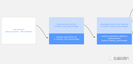 从上面的那张图可以看出,留给OB SERVER使用的内存又被system_memory_percentage参数分为两部分。其中(1-system_memory_percentage)被用于OB SERVER,system_memory_percentage被用于OB SERVER内的各个租户。