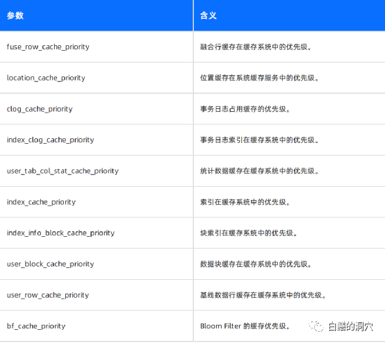 这种混合CACHE是容易因为某种数据突然暴涨而导致整个CACHE出现性能问题的,为了解决这个问题。OB引入了一系列的参数来控制各种数据在KVCACHE中的优先级。下图是控制这些优先级的参数列表。