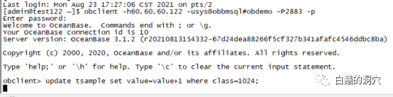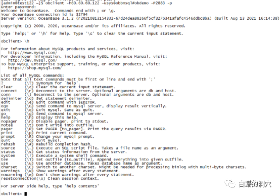 简单的分析了OB的内存结构后,我们先来体验一下我们实验室新装的OB数据库。为了和Oracle有一个对比,因此我们使用与Oracle兼容的引擎obclient去连接OB数据库。OB数据库也可以直接用MYSQL直接去连接。