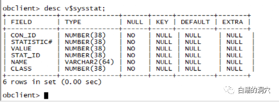 DESC命令是可以用的,而且令人惊喜的是v$sysstat依然存在,这对于做数据库监控与性能优化的人来说是一个福音。不过听蚂蚁的朋友说,目前v$sysstat的数据还不是很完备,随着新版本的迭代,会逐步完善,目前这张视图所能带给我们的有用信息还不多。