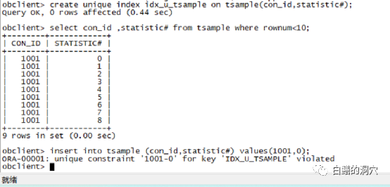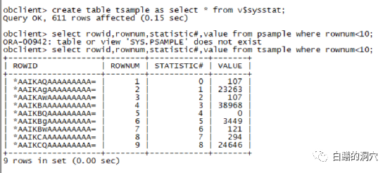我们创建一张测试表,可以看出v$sysstat有610条记录,从上面的例子可以看出,rowid,rownum这些伪列都是存在的。更有意思的是,我不小心写错表名的时候,报错信息也是ORA-00942,和Oracle是完全相同的。