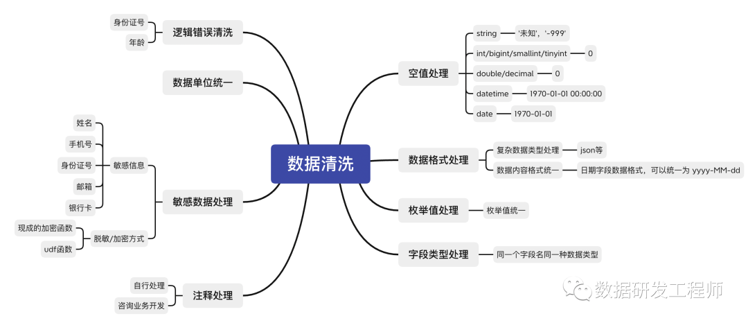 我在对候选人进行考察的时候,也经常会问到这个问题,主要是看一下候选人有没有真实工作经验,然后在开发过程中有没有独立思考,并且知其然更知其所以然,但是候选人回答的都比较片面,比如只是处理空值,可能是公司数据质量的原因,但是就算公司业务库数据质量比较高,我们也应该需要全面的了解一些数据清洗规范。