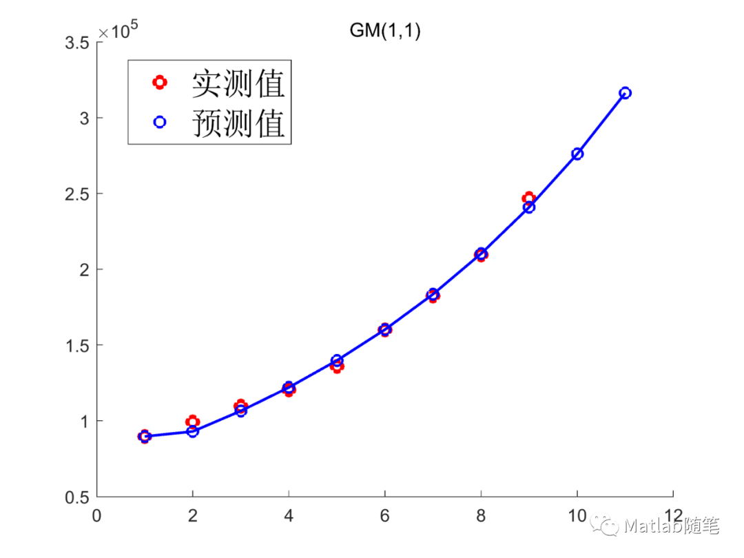 clear;clc;% 建立时间序列x0 = [89677 99215 109655 120333 135823 159878 182321 209407 246619]';% 需要预测几期数据count = 2;% 检验数据是否符合要求n1 = length(x0);lmd = x0(1:end-1)./x0(2:end);flag = min(lmd)>exp(-2/(n1+1)) & max(lmd)<exp(2/(n1+1));if ~flagerror('数据级比不符合要求');end% 计算一次累加生成序列x1 = cumsum(x0);% 计算邻均值等权数列z1 = 0.5 * ( x1(1:end-1) + x1(2:end) );% 构造矩阵B、YB = [-z1,ones(n1-1,1)];Y = x0(2:n1);% 计算u=[发展系数a,灰作用量b]u = (B'*B)\(B'*Y);% 计算模型拟合值syms x(t)x=dsolve(diff(x)+u(1)*x == u(2),x(0)==x1(1));xt=vpa(x,2);x1_hat=subs(x,t,0:n1-1+count);x1_hat=(double(x1_hat))';x0_hat=[x0(1);diff(x1_hat)];disp('预测值:')x0_hat(n1+1:end)% 模型精度评定e = x0(1:n1)-x0_hat(1:n1);s1 = std(x0);p = length(find(e-mean(e)<0.6745*s1))/n1;if p>=0.95disp('精度等级:1级(好)');elseif p>=0.80disp('精度等级:2级(合格)');elseif p>=0.7disp('精度等级:3级(勉强)');elsedisp('精度等级:4级(不合格)');end% 绘图说明hold onp1=plot(1:n1,x0,'ro','LineWidth',2.5);p2=plot(1:n1+count,x0_hat,'bo','LineWidth',1.5);p3=plot(1:n1+count,x0_hat,'b-','LineWidth',1.5);legend([p1,p2],'实测值','预测值','FontSize',18);title('GM(1,1)');hold off