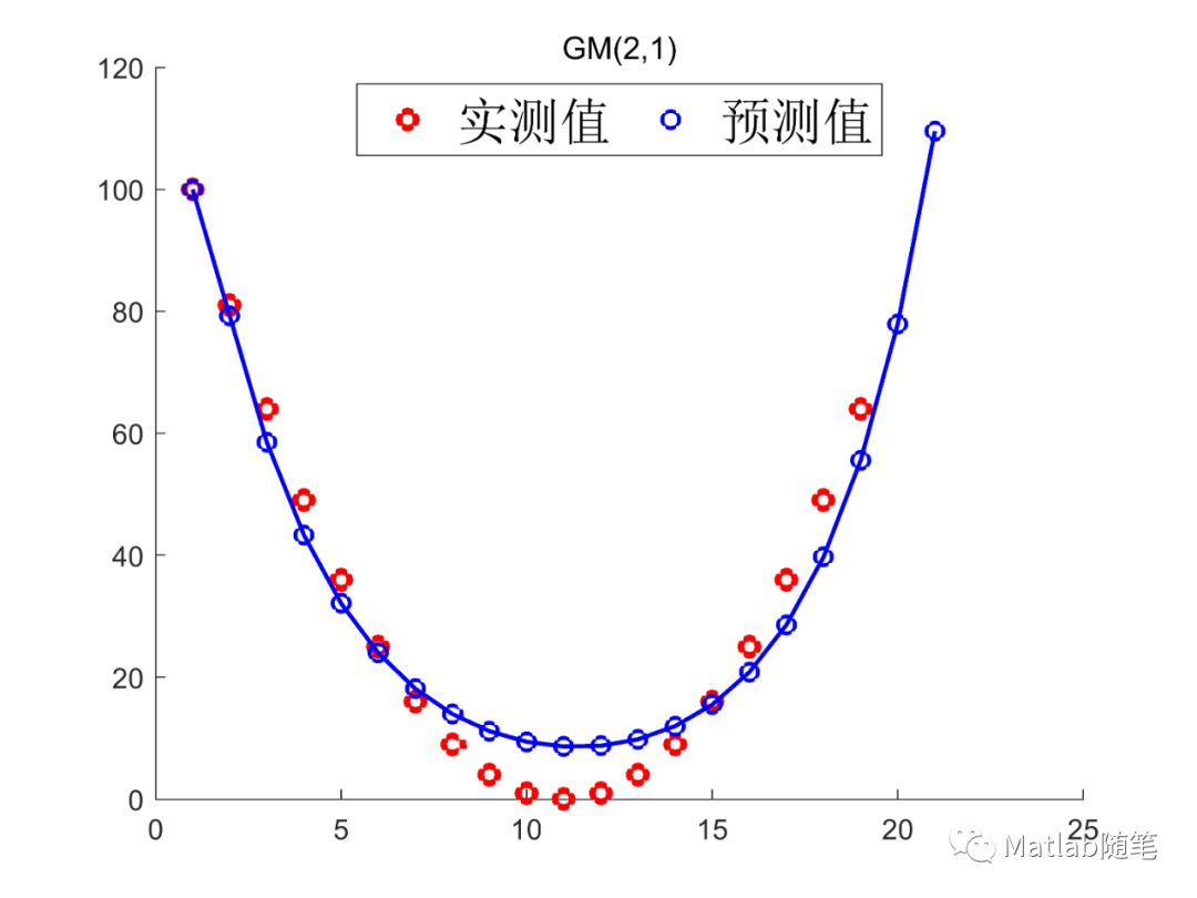 clear;clc;% 建立时间序列x=-10:8;x0=(x.^2)';n1 = length(x0);% 需要预测几期数据count = 2;% 计算一次累加生成序列x1 = cumsum(x0);% 计算一次累减生成序列alpx0 = x0(2:end)-x0(1:end-1);% 计算邻均值等权数列z1 = 0.5 * ( x1(1:end-1) + x1(2:end) );% 构造矩阵B、YB = [ -x0(2:end),-z1,ones(n1-1,1)];Y = alpx0;% 计算发展系数a和灰作用量bu = (B'*B)\(B'*Y);% 计算模型拟合值syms x(t)x=dsolve(diff(x,2)+u(1)*diff(x)+u(2)*x==u(3),x(0)==x1(1),x(n1-1)==x1(n1));xt=vpa(x,2);x1_hat=subs(x,t,0:n1-1+count);x1_hat=(double(x1_hat))';x0_hat = [x0(1);diff(x1_hat)];disp('预测数据:')x0_hat(n1+1:end)% 模型精度评定e = x0(1:n1)-x0_hat(1:n1);s1 = std(x0);p = length(find(e-mean(e)<0.6745*s1))/n1;if p>=0.95disp('精度等级:1级(好)');elseif p>=0.80disp('精度等级:2级(合格)');elseif p>=0.7disp('精度等级:3级(勉强)');elsedisp('精度等级:4级(不合格)');end% 绘图说明hold onp1=plot(1:n1,x0,'ro','LineWidth',2.5);p2=plot(1:n1+count,x0_hat,'bo','LineWidth',1.5);p3=plot(1:n1+count,x0_hat,'b-','LineWidth',1.5);legend([p1,p2],'实测值','预测值','FontSize',18);title('GM(2,1)');hold off