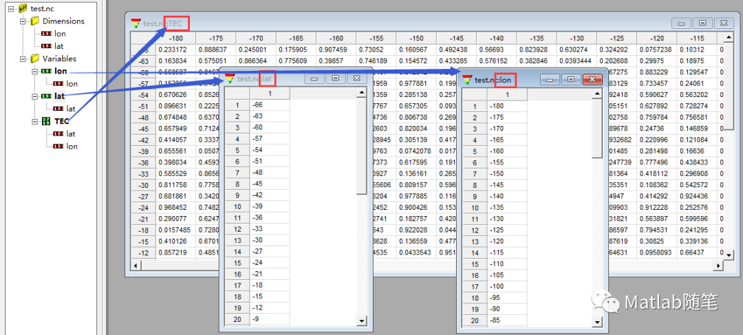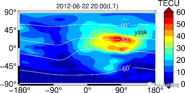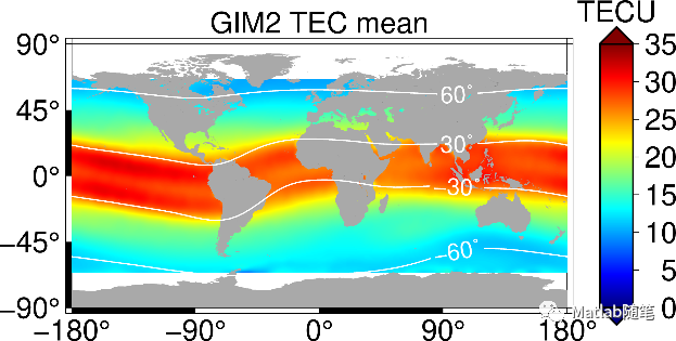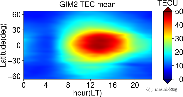 % 读取 NetCDF 数据源中的变量数据ncfile='test.nc';lon=ncread(ncfile,'lon');lat=ncread(ncfile,'lat');TEC=ncread(ncfile,'TEC');TEC=TEC';%注意:需要转置!
