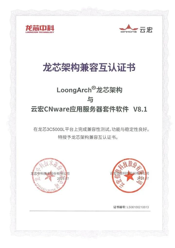 近日,龙芯中科技术股份有限公司(以下简称“龙芯中科”)云技术团队依托本地化适配服务平台——广东龙芯中科电子科技有限公司,与云宏信息科技股份有限公司(以下简称“云宏”)基于龙芯3C5000L平台成功完成兼容性适配。双方经测试结果得出,LoongArch龙芯架构与云宏CNware应用服务器套件软件V8.1,在龙芯3C5000L平台服务器上运行稳定、高效安全、功能完善、体验良好,为企业及应用提供强有力可靠保证,也为龙芯云团队进一步完善云平台技术创新建设,打牢关键技术基础底座,筑牢坚实根基。