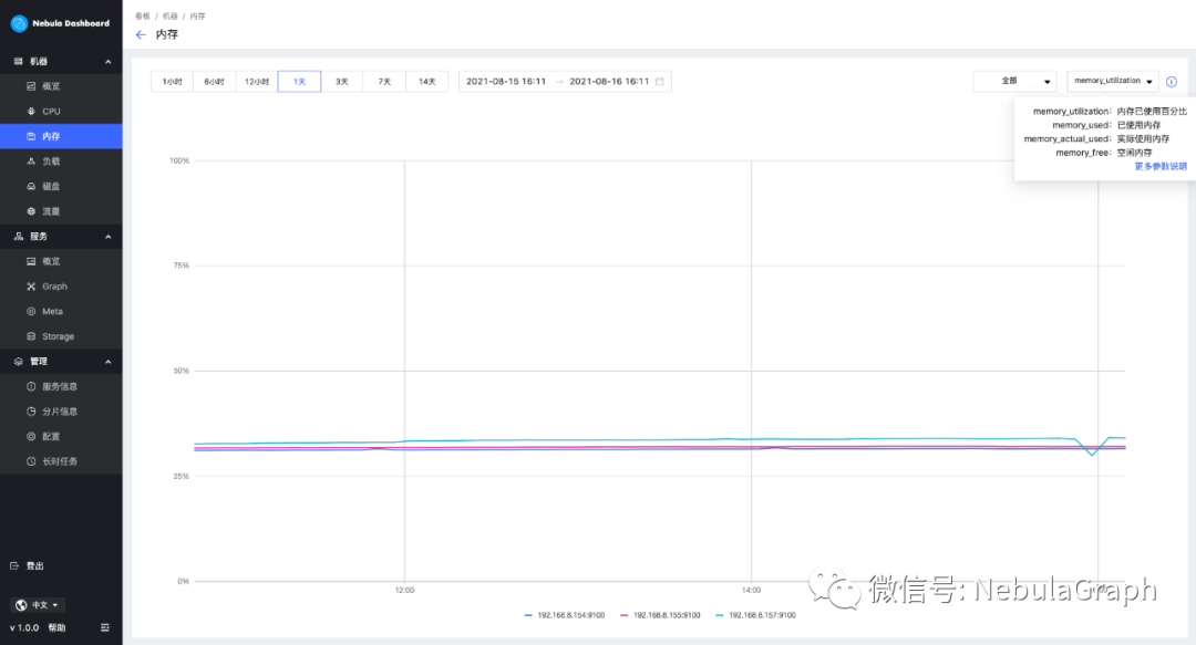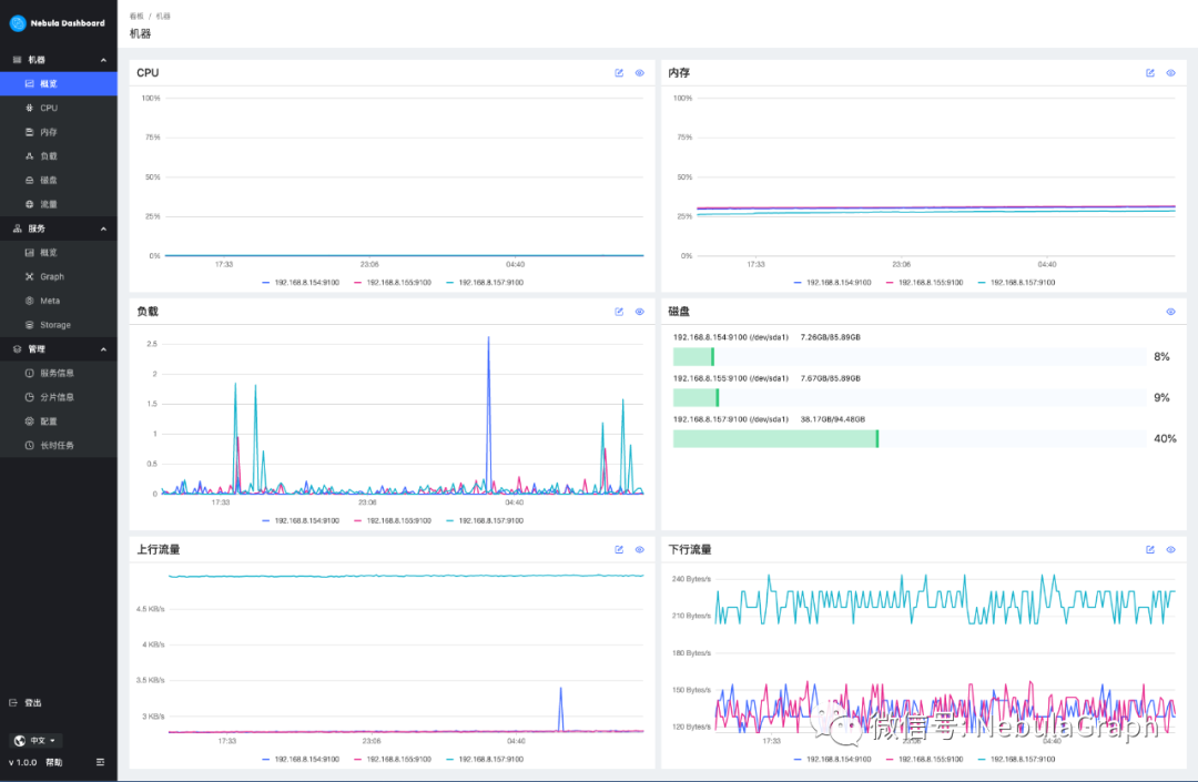 在 Nebula Graph Dashboard 中,用户可监控并可视化展示当前所配置节点机器中的 CPU、内存、负载、磁盘、流量信息。