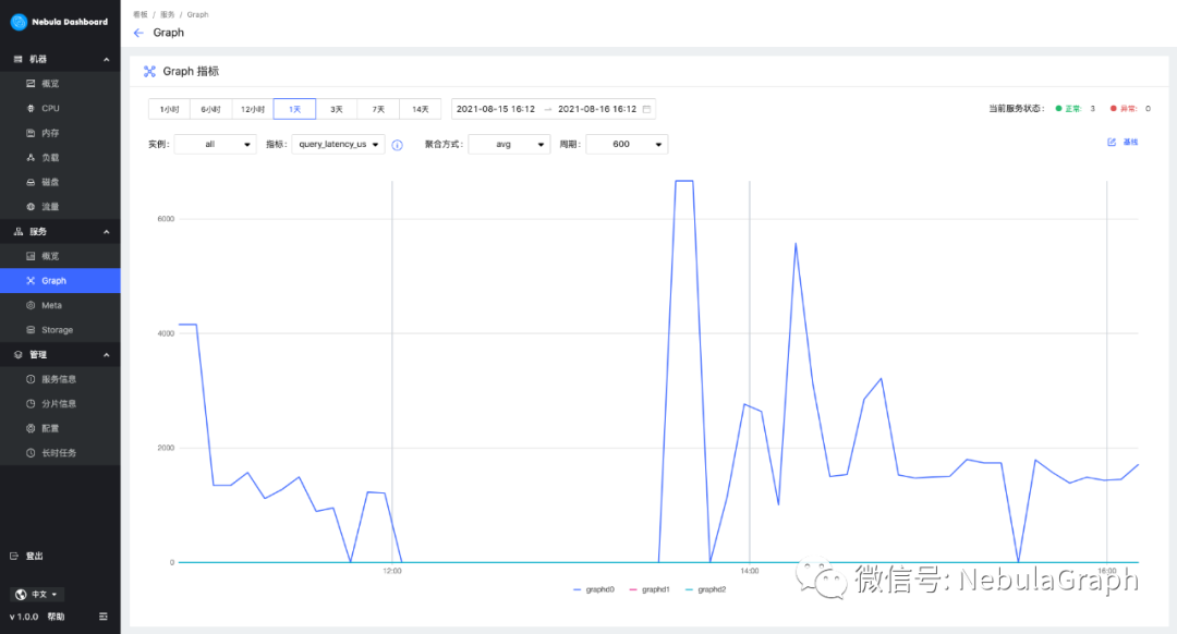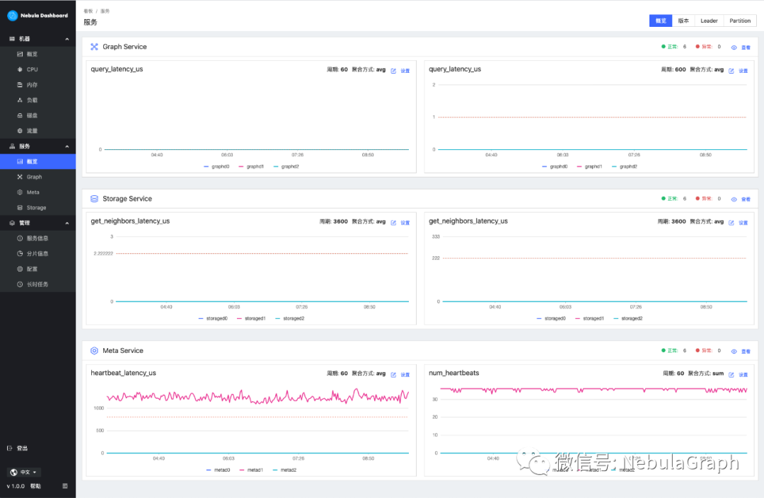 服务监控模块支持监控配置节点的 Nebula Graph 的 Graph、Meta、Storage 服务。服务监控概览模块,可查看不同服务状态的相关个数,以及支持选择相同服务中两个不同的指标参数画板进行对比分析。