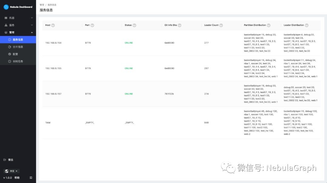 在管理模块,用户可快速查询和浏览指定 Space 的查询服务信息、分片信息。同时,Dashboard 管理模块展示了各个服务(storage、graph)的配置信息,和所有作业的信息。