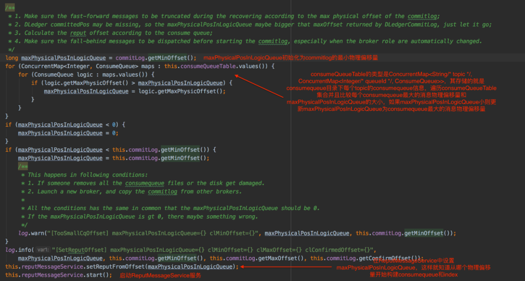 在RocketMQ broker启动的过程中会启动很多服务,其中就包含DefaultMessageStore,DefaultMessageStore启动的过程中会启动ReputMessageService,ReputMessageService的作用就是实时转发commitlog文件更新事件,然后会有对应的服务来构建consumequeue和index文件。在启动DefaultMessageStore过程中会初始化参数maxPhysicalPosInLogicQueue,参数maxPhysicalPosInLogicQueue表示从哪个commitlog offset开始构建consumequeue和index,maxPhysicalPosInLogicQueue初始化过程如下: