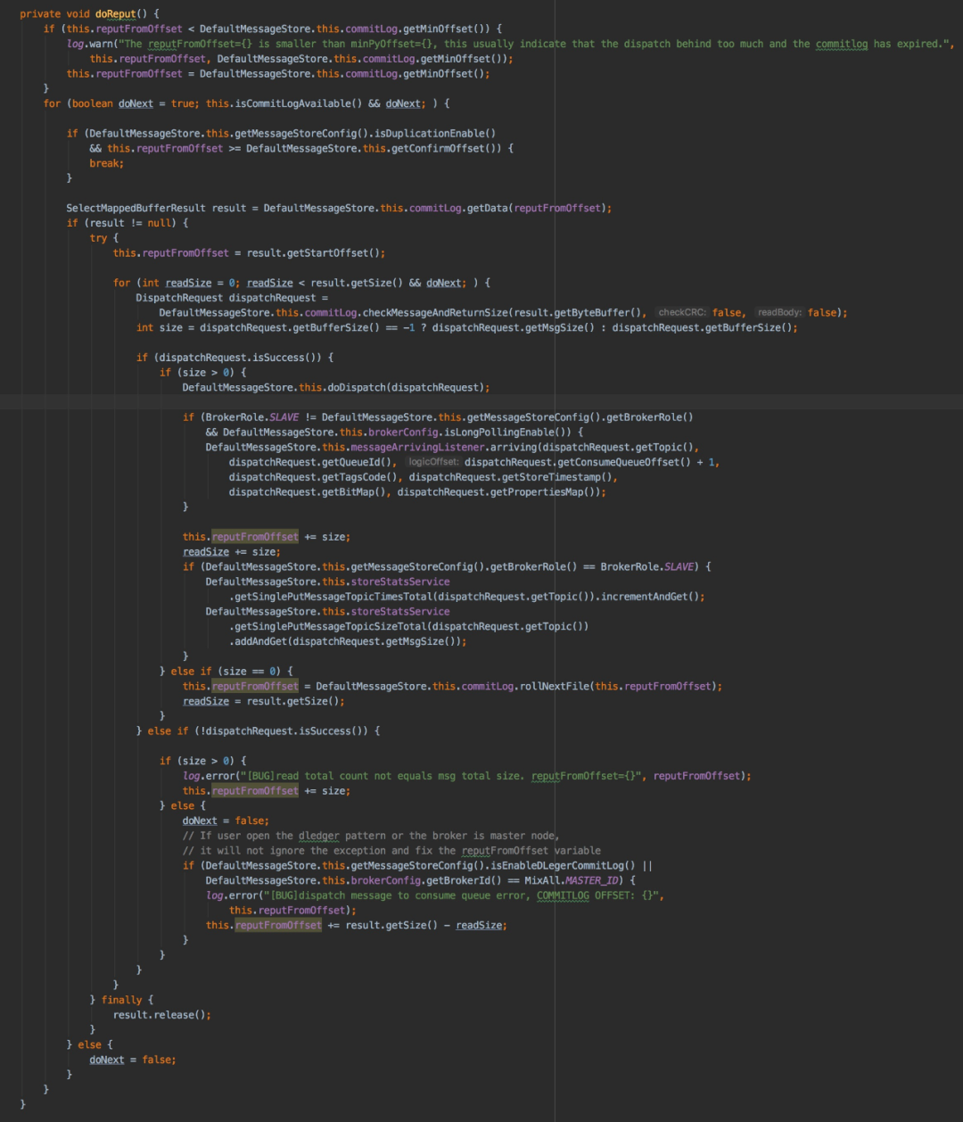 在遍历的过程中每当一条数据构建consumequeue和index完成的同时会更新reputFromOffset,当commitlog中一个mappedFile中的数据完成构建consumequeue和index的任务后会通过commitlog的rollNextFile方法来获取下一个mappedFile,然后再遍历数据并构建DispatchRequest对象通过doDispatch方法构建consumequeue和index