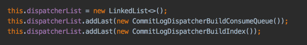 在初始化ReputMessageService时会在dispatcherList中添加构建consumequeue和index文件的服务,CommitLogDispatcherBuildConsumeQueue是用来构建consumequeue,CommitLogDispatcherBuildIndex是用来构建index: