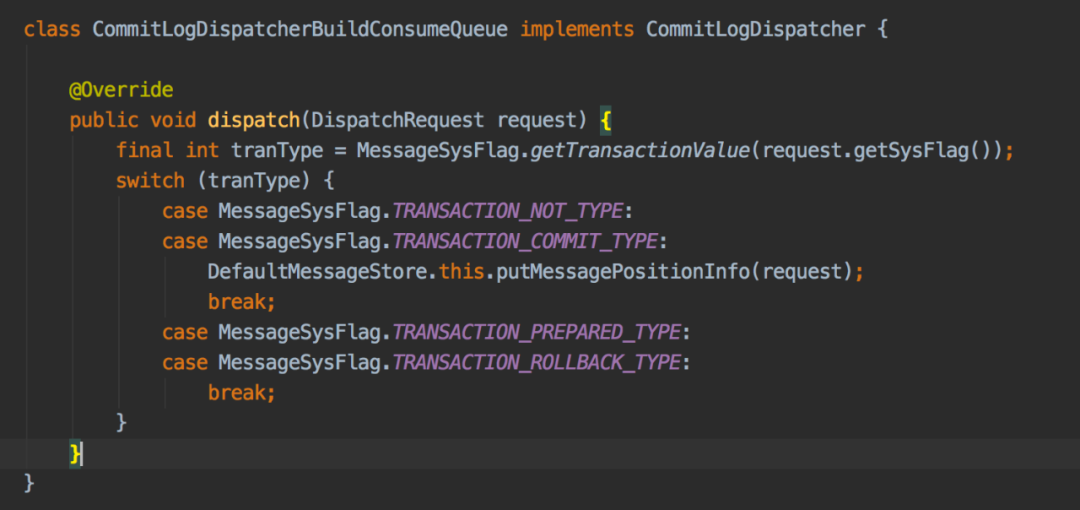 构建consumequeue的doDispatch方法如下,构建consumequeue的内部实现方法是putMessagePositionInfo(DispatchRequest dispatchRequest)