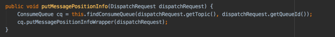 dispatchRequest中含有消息的topic及queueid,所以会根据topic和queueid获取consumequeue文件,findConsumeQueue(String topic, int queueId)方法获取consumequeue的实现逻辑是从consumeQueueTable中先根据topic获取目标topic的consumequeue集合(该集合是一个map,key是queueid,value是consumequeue),接下来根据queueid从consumequeue集合中直接获取consumequeue文件即可